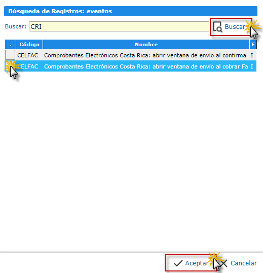 procedemos a buscar los eventos (CELFACCRI - CELFACCRI2) y seleccionamos el