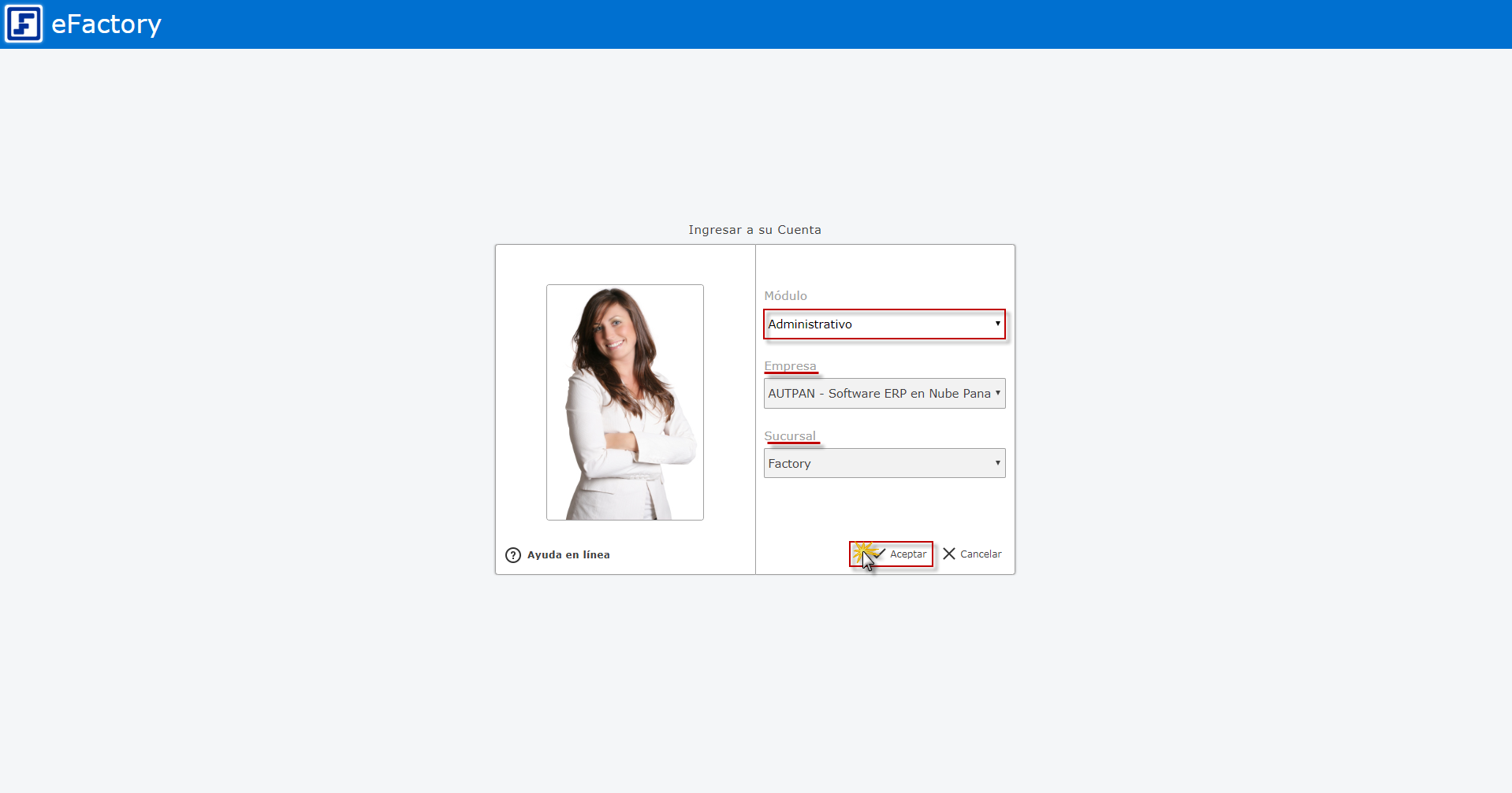 a. Para ingresar debemos iniciar en eFactory con nuestro Usuario, Contraseña y seleccionaremos el botón