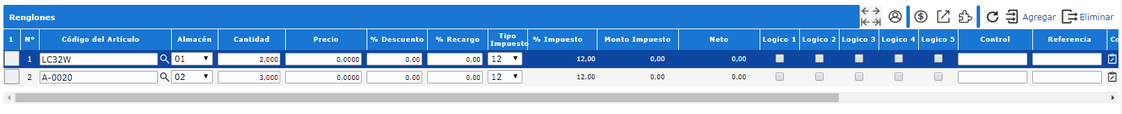 a. Para agregar un renglones debemos ubicarnos en la Sección de Renglones y ir agregando los artículos afectados para facturación electrónica SRI Ecuador, en la nota de crédito o débito para la facturación electrónica SRI Ecuador. Normalmente se debe llenar los siguientes campos: