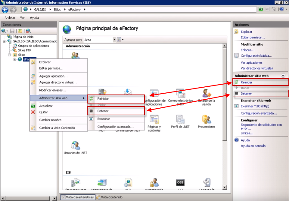 Al encontrar eFactory, podemos observar en la pantalla donde dice eFactory, donde haremos clic al botón derecho se desplegara una lista donde procedemos a buscar Administrar sitio Web Flecha: Reiniciar y Detener También podemos encontrar en la parte de la pantalla derecha un menú de Acciones Administrar sitio Web podemos encontrar el botón Reiniciar y Detener el sitio Web.