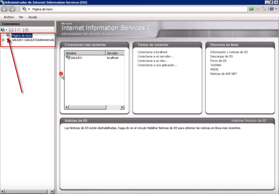 Luego de seleccionar Administrador de Internet Information Services (IIS), procedemos a seleccionar Galileo que se encuentra ubicado en la parte izquierda de la pantalla, para proceder a buscar el sitio Web eFactory.