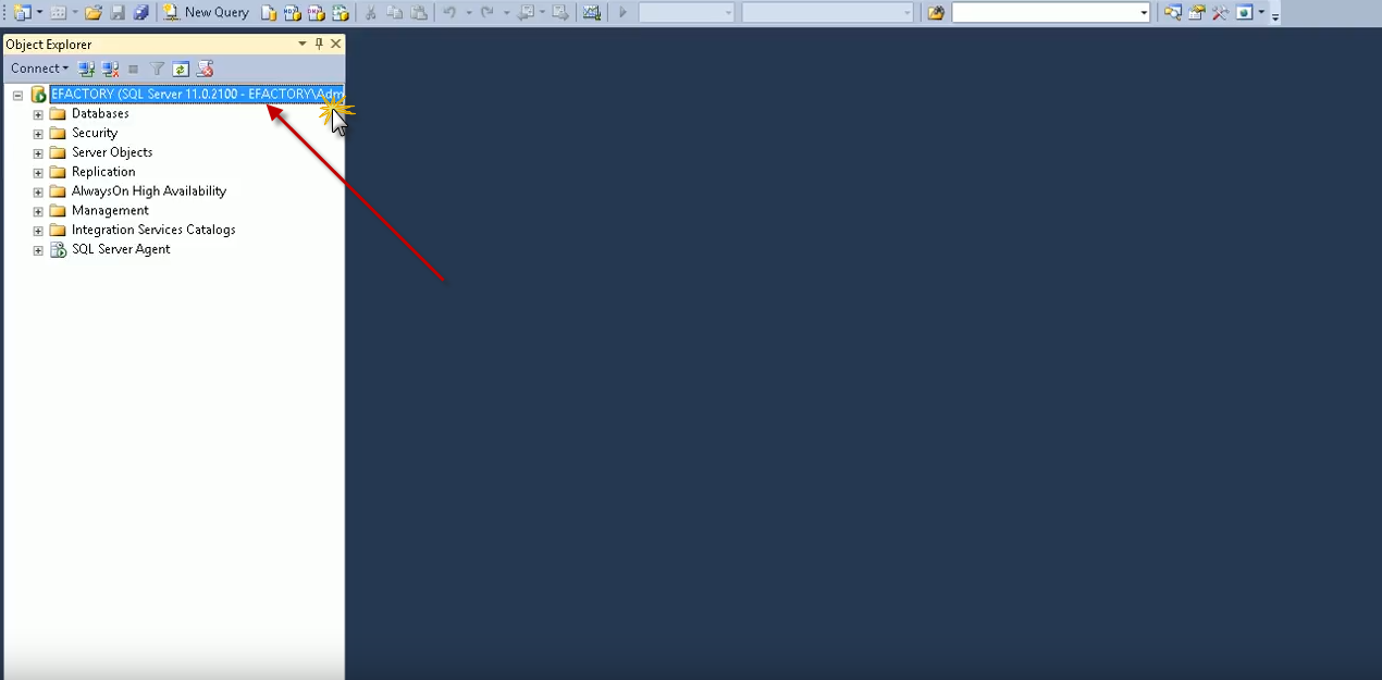 Para ingresar debemos buscar en nuestro escritorio el ícono de SQL Server Management Studio, luego de tenerlo ubicado presionaremos el ícono, al abrir el SQL Server Management Studio nos ubicamos en la parte izquierda de la pantalla y haremos clic derecho a EFACTORY (SQL Server 11.0.2100 - EFACTORY\Administrator).
