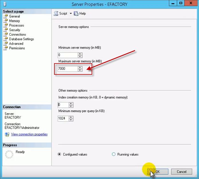 Al ubicar Maximum server memory (in MB) procedemos a editar el tamaño de la Memoria RAM y procedemos a seleccionar el botón OK.