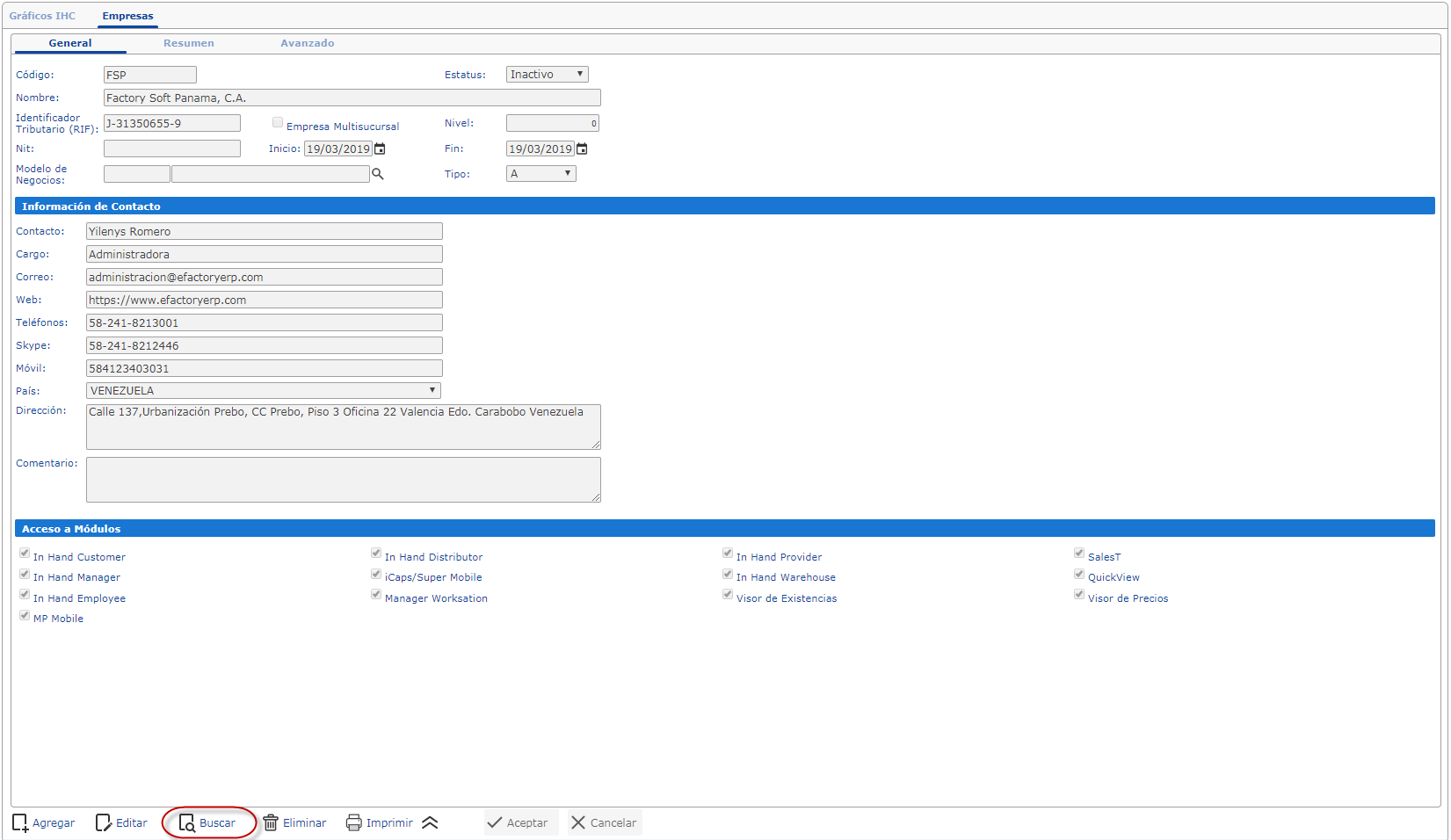 a. Para modificar un campo en la ficha de empresas primero tenemos que buscar la emprese y para eso seleccionaremos el botón