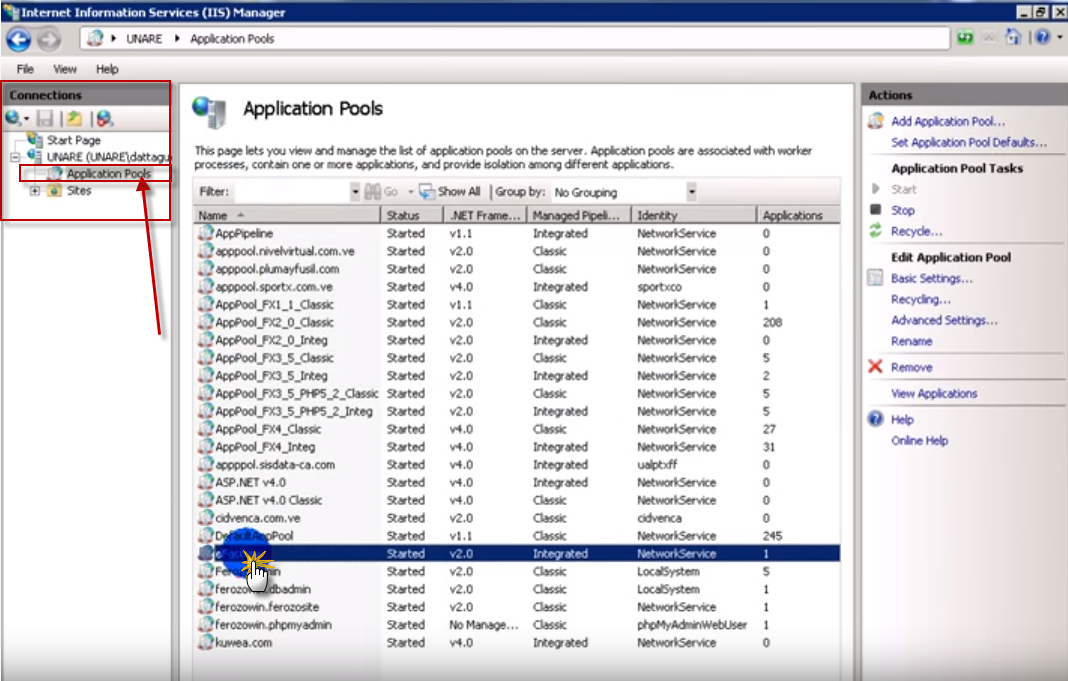 Luego de seleccionar Administrador de Internet Information Services (IIS), procedemos a seleccionar UNARE que se encuentra ubicado en la parte izquierda de la pantalla en Connections, luego se desplega una lista donde seleccionaremos Application Pools.