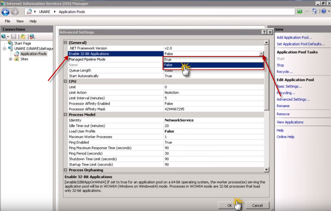 Al presionar Advanced Settings podemos observar la ventana donde modificaremos el Pools. Buscamos en la ventana en la parte de General y luego seleccionaremos Enable 32-bit Applications y seleccionaremos en la lista el valor False y para finalizar la modificación de Application Pools presionaremos el botón OK.