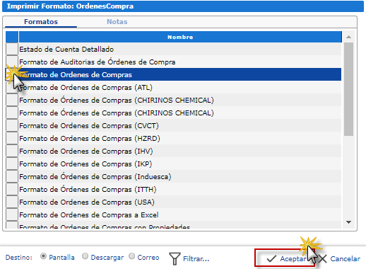 Se nos desplegara un panel en el cual deberemos seleccionar el formato "Formato Ordenes de Compra" para finalizar presionaremos