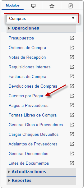 b. En el módulo Compras, desplegamos el componente Operaciones y activamos el sub componente Cuentas por Pagar.