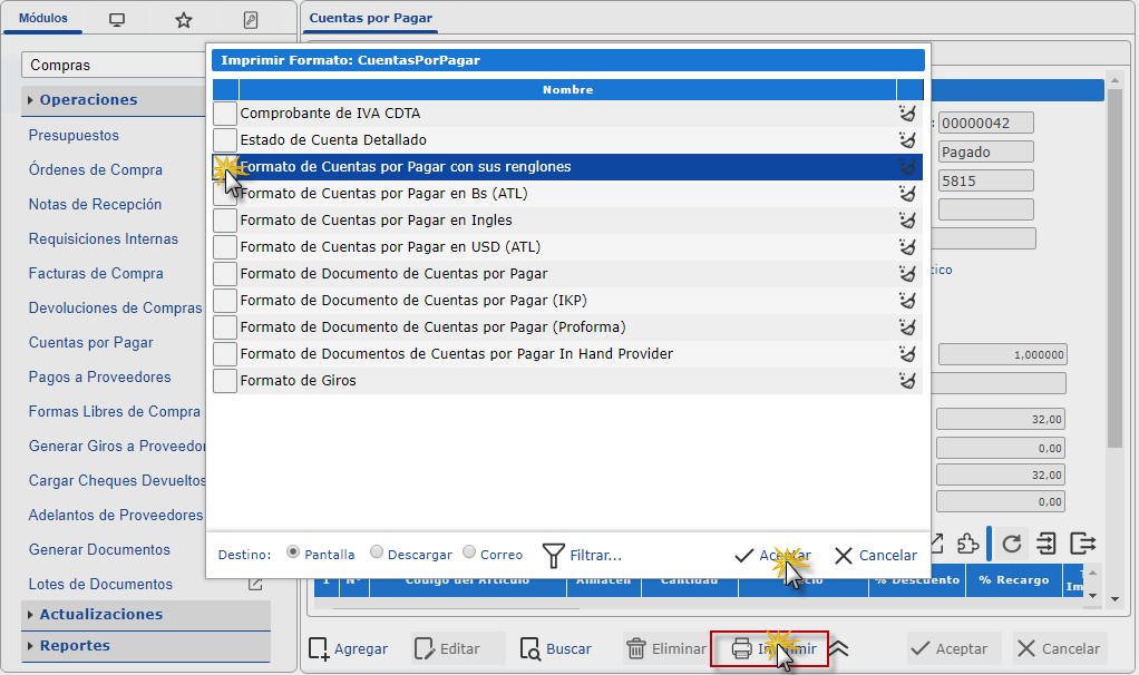 Veamos los pasos para imprimir rápidamente una cuenta por pagar en el Módulo de Compras.
