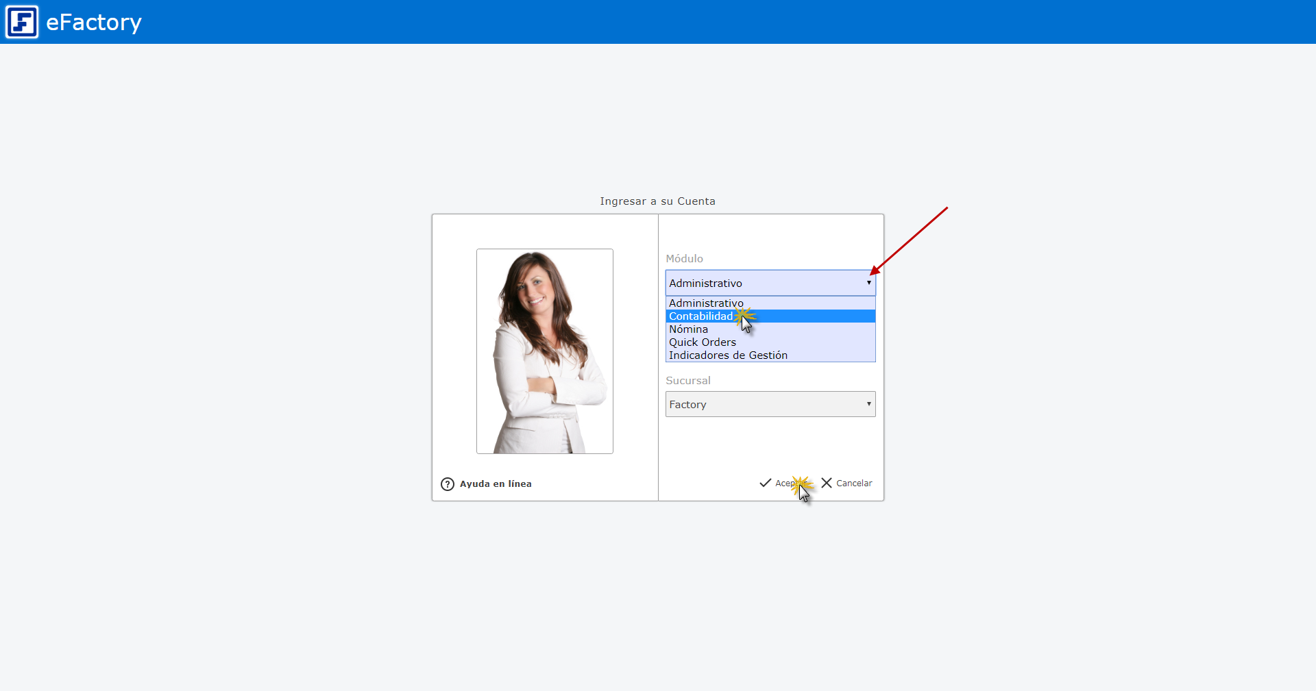 a. Al iniciar eFactory con nuestro Usuario y Contraseña, Se procede a Seleccionar el módulo Contabilidad,