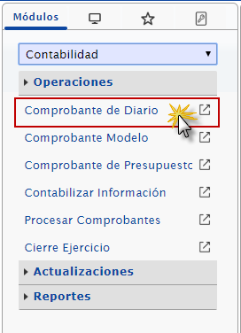 b. En el módulo Contabilidad, desplegamos el componente Operaciones y activamos el sub componente Comprobante Diario