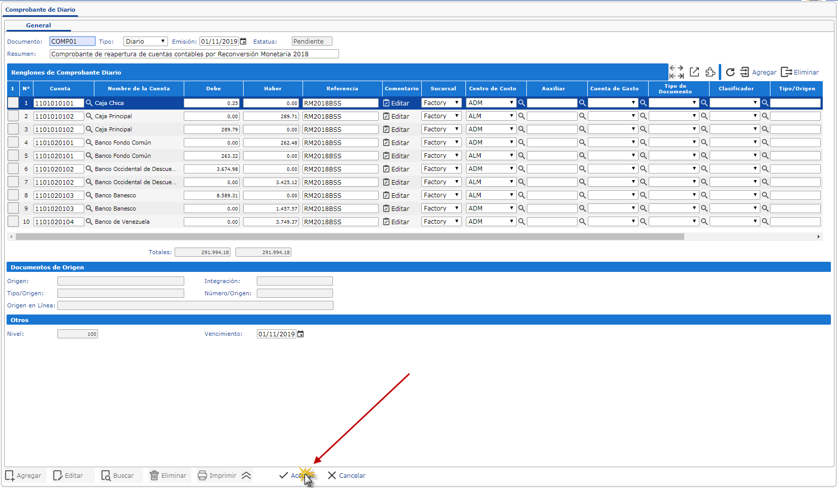 a. Ingrese al módulo Contabilidad, sección Operaciones, se observa la pantalla de Comprobante Diario y presionaremos el botón