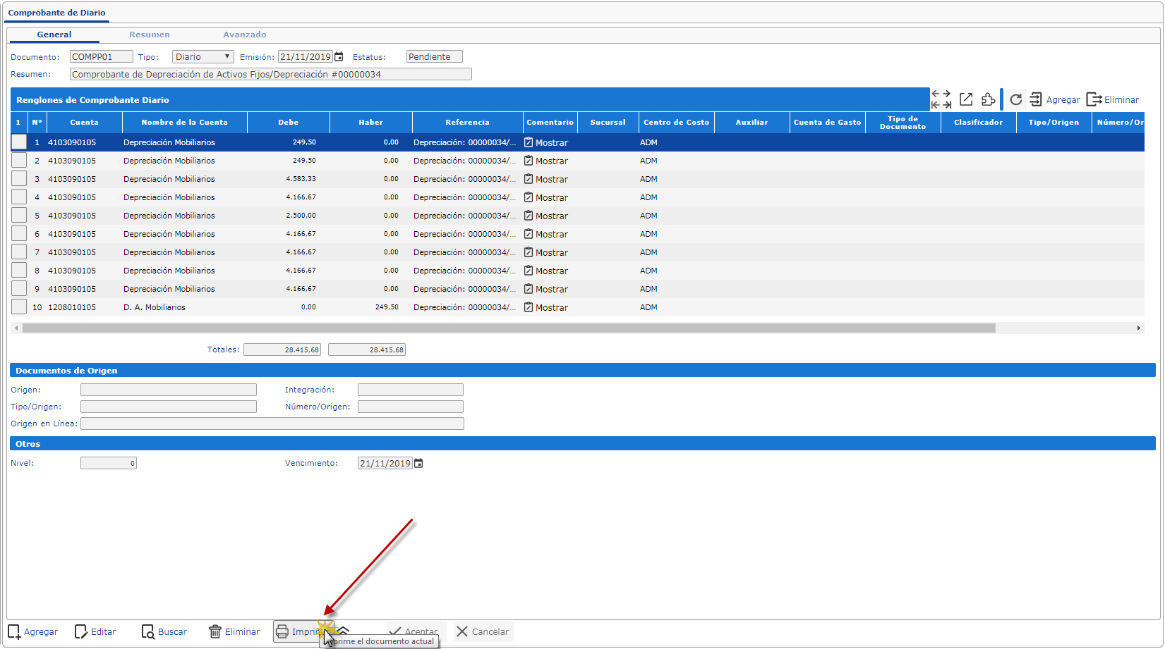 para generar el Comprobante.a. Para imprimir el comprobante de Diario Generado procedemos a seleccionar el botón