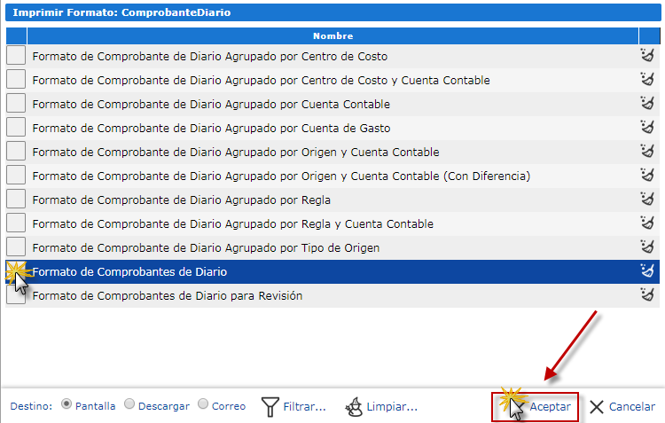 Luego se nos muestra la ventana de Imprimir Comprobante de Diario y seleccionaremos el formato a imprimir en este caso es el formato Formato de Comprobante de Diario y