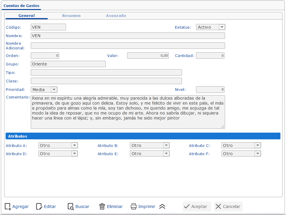 Con estos sencillos pasos, habrá creado una cuenta de gastos, sin embargo es probable que necesite agregarle características adicionales que la definan aún más y para ello eFactory proporciona los controles donde podrá agregar los valores necesarios.