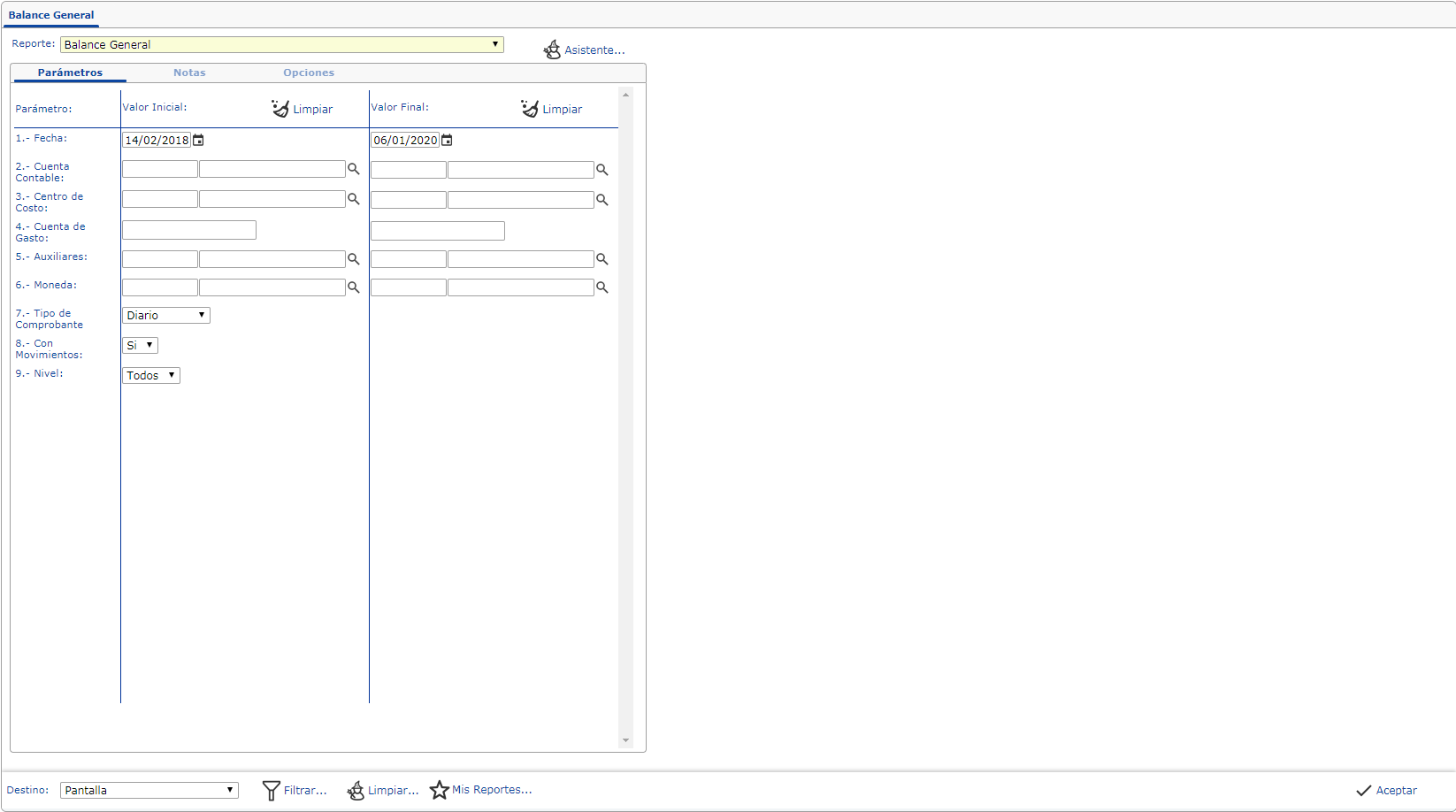 a. Luego de haber seleccionado el reporte Balance General, se debe configurar los parámetros para generar el Balance General como desee. Los parámetros son los siguientes: