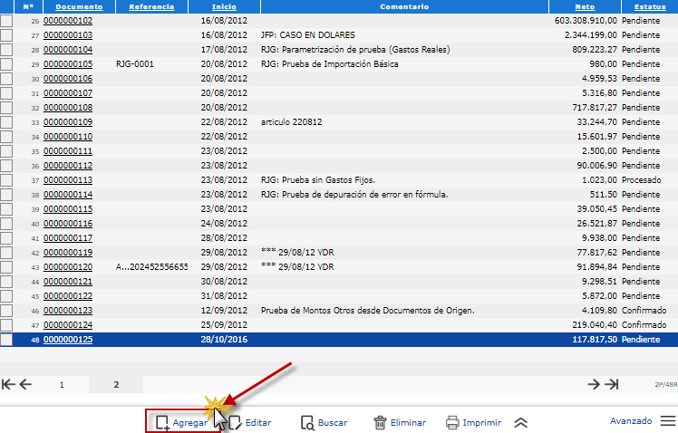 donde se pueden buscar las Órdenes de Compra, Facturas de Compra, Pagos a Proveedores y Órdenes de Pago, cuyo monto afectará los costos de los artículos importados y procedemos
