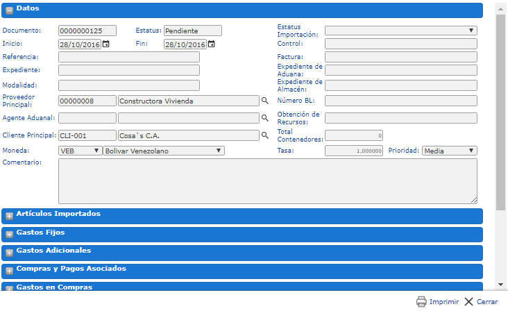 b. En la sección de Importaciones especificamos principalmente los siguientes parámetros: