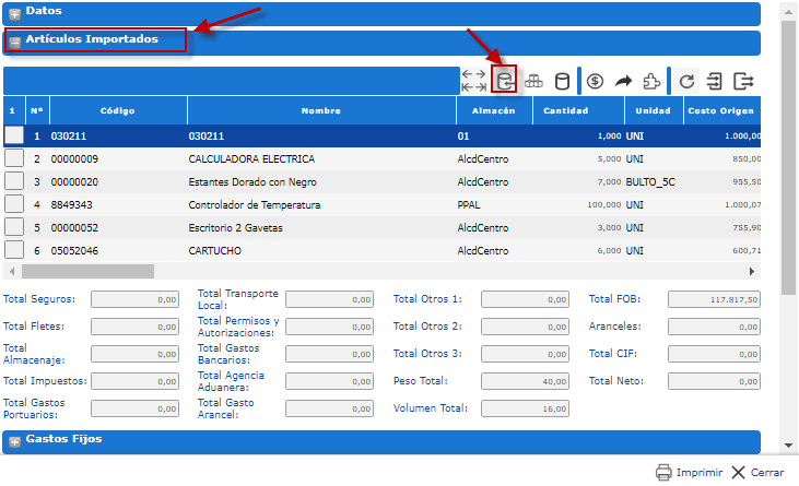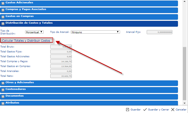 a. Hacemos clic donde dice Distribución de Costos y Totales, y procedemos a inspeccionar nuevamente los artículos importados, en la sección correspondiente,