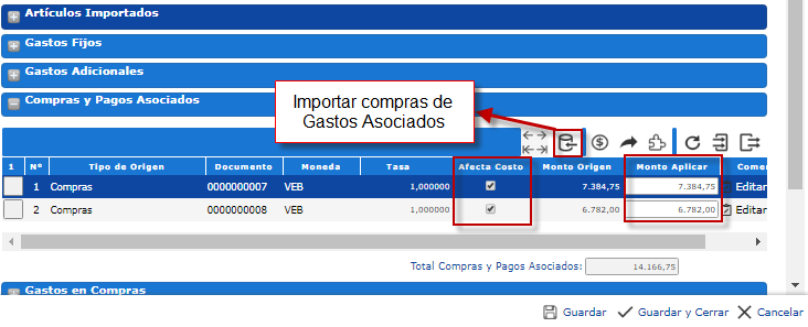 y los documentos seleccionados se insertarán en la sección de Compras y Pagos Asociados.