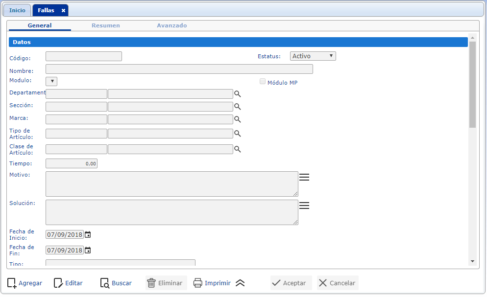 Es un instrumento que permite definir y administrar las fallas que se presentan en la organización, a través de la recolección de los datos que describen el motivo, la duración, valor y solución de la falla, en este mismo sentido, permite recoger los datos del departamento y sección afectados. Esta herramienta se encuentra ubicada en el módulo MP, sección Actualizaciones, opción Fallas.