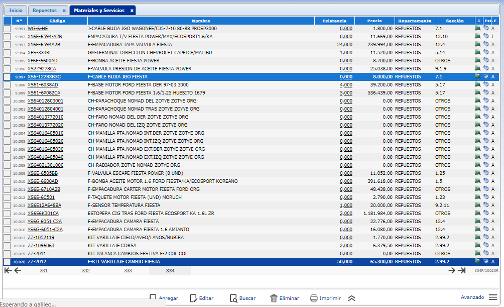En su pantalla podremos observar en un solo paso, el listado de materiales y servicios disponibles con sus existencias, precios y status, también podremos observar el nombre del departamento y la sección encargada.
