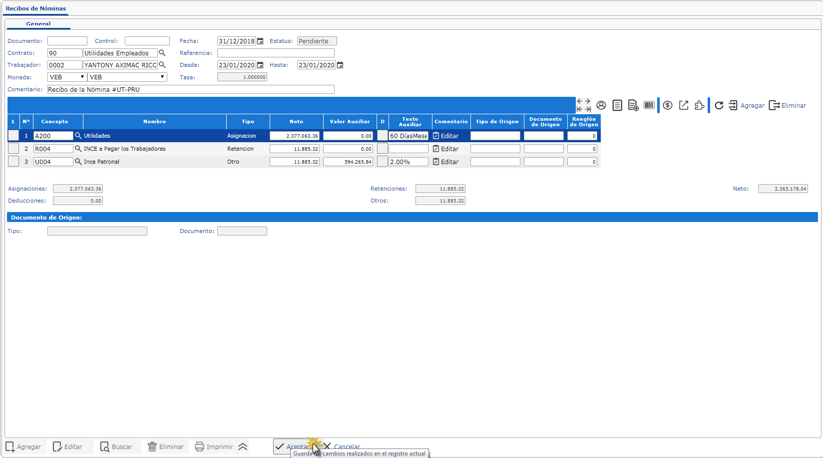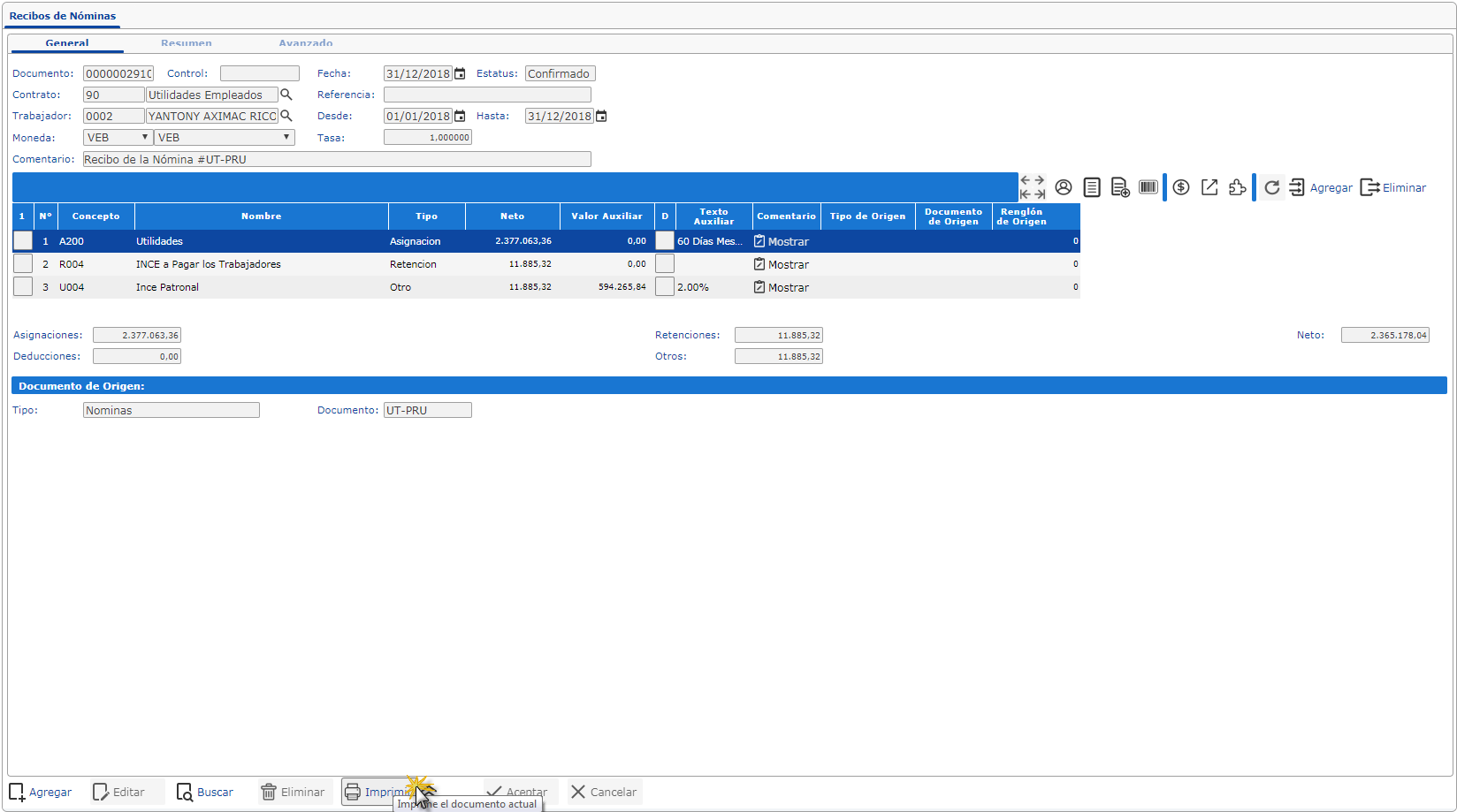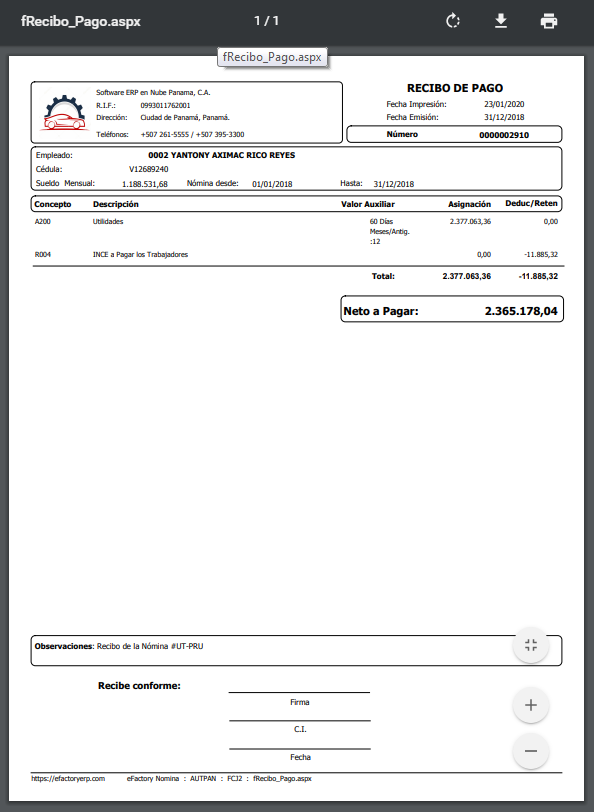 c. Luego se observa detalladamente el formato de Recibo de Paggo del Módulo de Nómina.