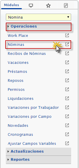 b. Después seleccionaremos el módulo Nomina, desplegamos el componente Operaciones y activamos la opción Nomina.