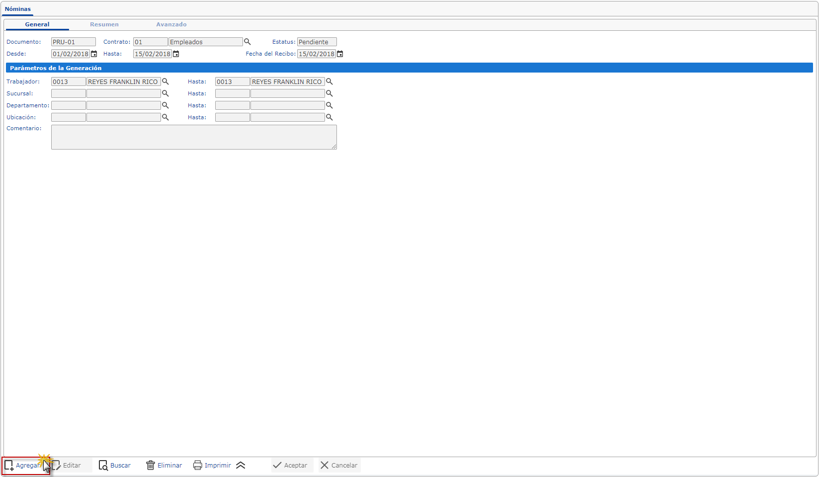para agregar una Nómina.