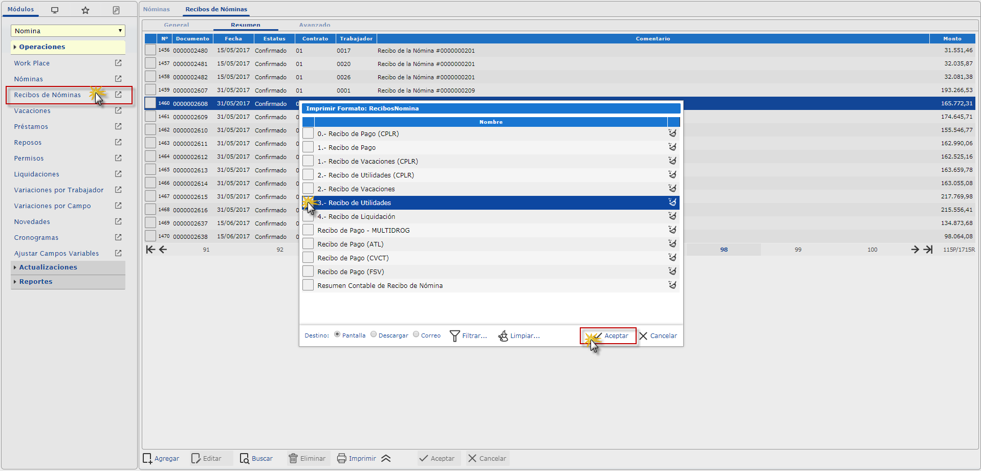 b. Nos ubicamos en la pantalla de Imprimir Formato: Recibos de Nóminas, donde seleccionaremos la opción de Recibo de Utilidades y presionaremos el botón