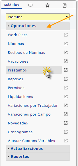 b. Luego de iniciar ubicamos el módulo Nómina, desplegamos el componente Operaciones y activamos el sub componente Préstamo