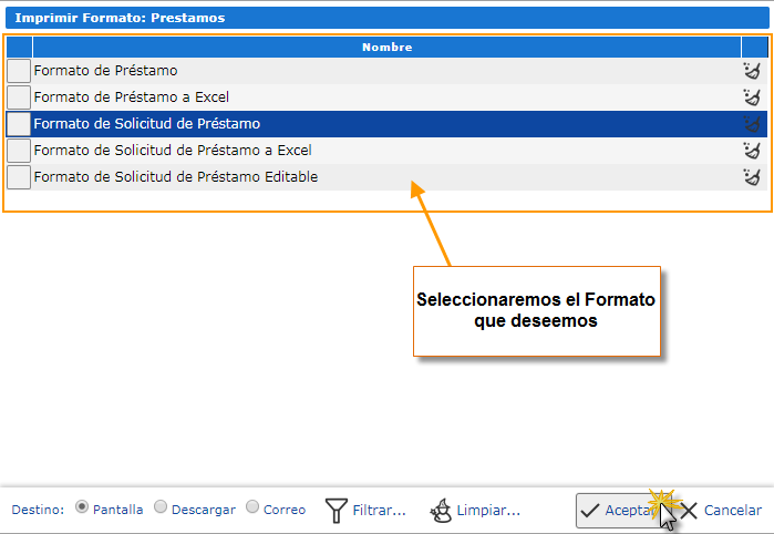 Si deseas imprimir el comprobante del préstamo, puedes hacerlo haciendo clic el botón Imprimir, allí se abrirá una ventana donde deberás seleccionar el formato de impresión. Existen 3 formatos de impresión para los préstamos que son: