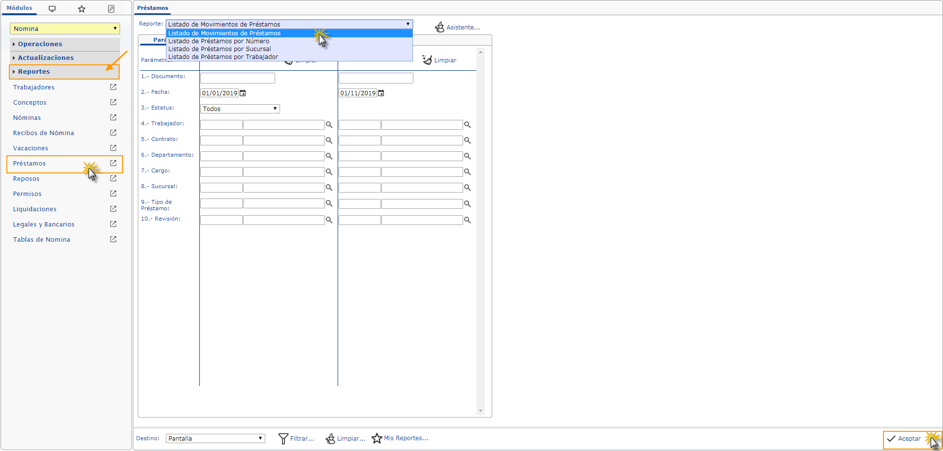 Al seleccionar el reporte deseado sólo debes completar los parámetros y dar clic en el botón Aceptar para generar el documento.