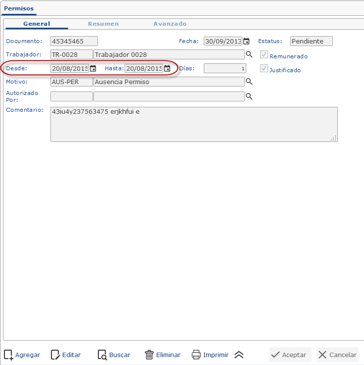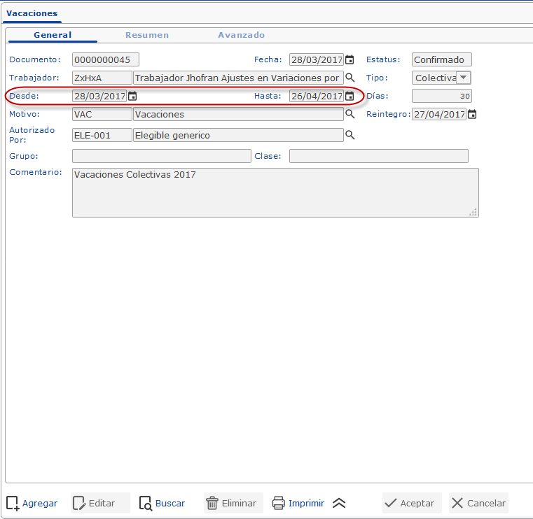 Vacaciones: Indican inicio y fin de las vacaciones de un empleado. Estas son consideradas en los contratos de sueldos y salarios, ya que los días de vacaciones no