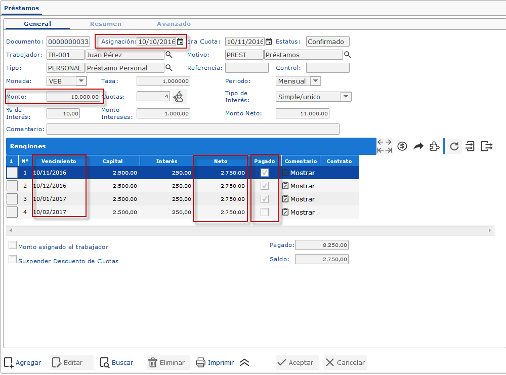 Préstamos: Como su nombre lo indica, representan un préstamo realizado al trabajador, el cual será pagado por el mismo mediante dos o más cuotas. En este documento se indica la fecha en que se asignará el monto del préstamo al trabajador, y las fechas y montos de las cuotas. Los contratos de sueldos y salarios harán la asignación del monto del préstamo al generar la nómina de la fecha indicada, y harán las deducciones de las cuotas en las nóminas siguientes cuando coincidan con las fechas de las mismas; cuando cada cuota sea deducida en el contrato correspondiente se marcará la misma como pagada, reduciendo el saldo pendiente por pagar.