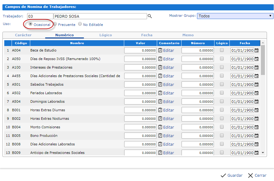 Los campos marcados como uso Ocasional almacenan valores que se asignan una vez al trabajador y que mantendrán el mismo valor hasta que sean cambiados de nuevo manualmente.