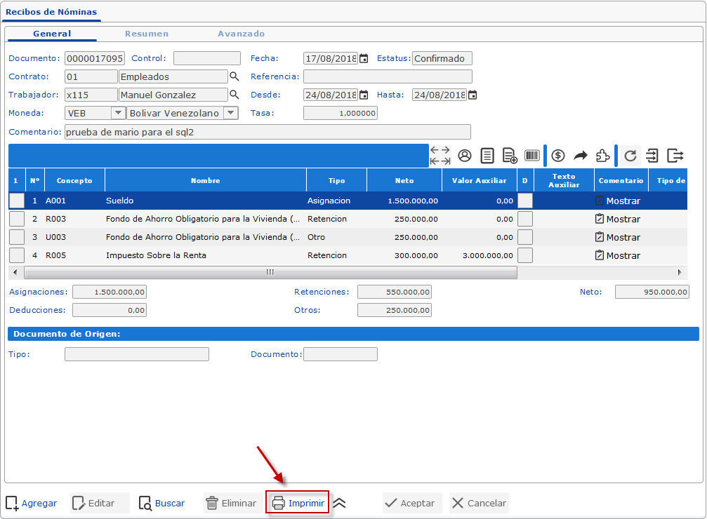Luego de verificar que los recibos generados sean correctos se debe confirmar el Documento de Nómina; este paso es necesario para ejecutar los conceptos de cierre de la nómina, que incluyen por ejemplo la actualización de los días de vacaciones disponibles, monto acumulado de prestaciones sociales, saldos de préstamos, etc.