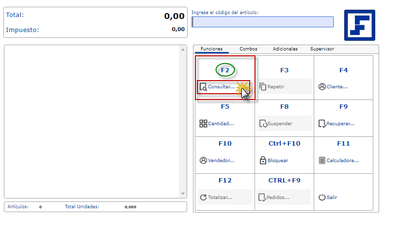 b. Luego se muestra la pantalla del sistema IPos, donde seleccionamos F2 o el botón