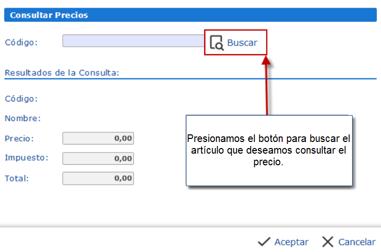 en el sistema, podemos observar la ventana Consultar Precios, donde podemos buscar los articulos deseado en tan solo presionar el botón de