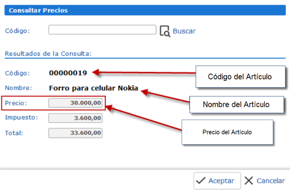 b. Luego seleccionar el Artículo se verá los datos del artículo en el resultado de la consulta que son: Código, Nombre, Precio, Impuesto y Total.