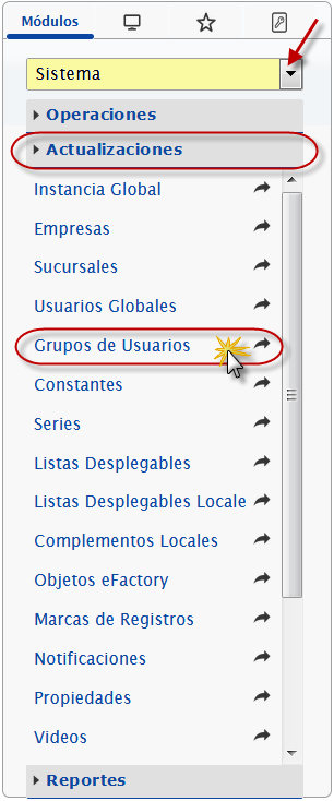 sección Actualizaciones y activamos el sub componente de Grupos de Usuarios.