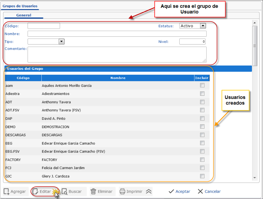 a. Al activar el sub componente "Grupos de Usuarios", se muestra el fichero donde procedemos a seleccionar el botón