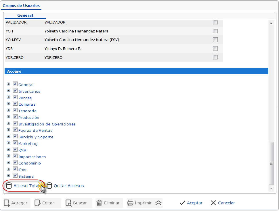 o también puede seleccionar en el cuadro los accesos que le corresponda al usuario.