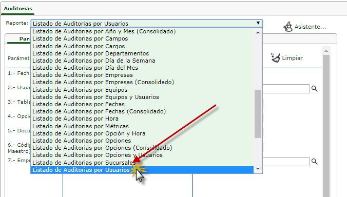 a.Al seleccionar el sub. componente Auditorias se muestra su pantalla, donde Buscaremos el Reportes de "Listado de Auditorias por Usuarios".