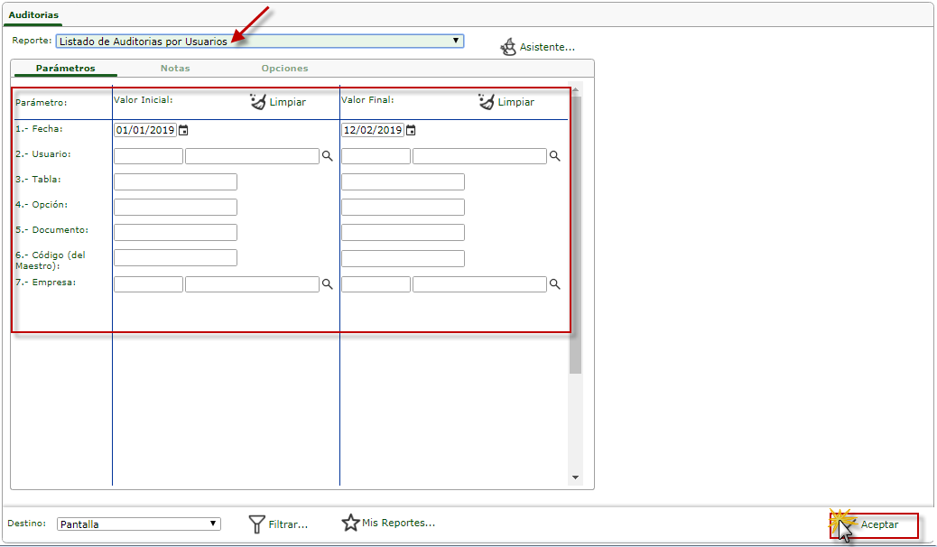 b. Luego podemos observar la ventana donde observamos la ficha donde llenaremos los datos Fecha "Valor Inicial - Valor Final", allí colocaremos las fechas correspondiente para generar la Auditorias y procedemos a presionar el botón de "opciones".