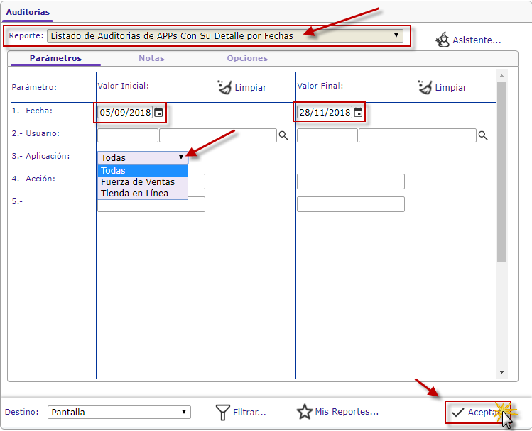 Donde colocaremos los datos correspondiente para generar la Auditorias por fechas