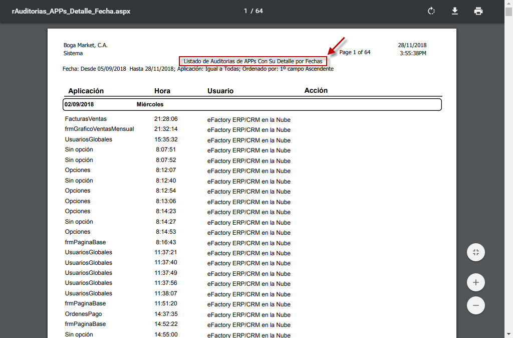 a. Se muestra la ventana de Auditorias, donde Buscaremos el Reportes de "Listado de Auditorias de la APPs con su Detalle por Fechas".