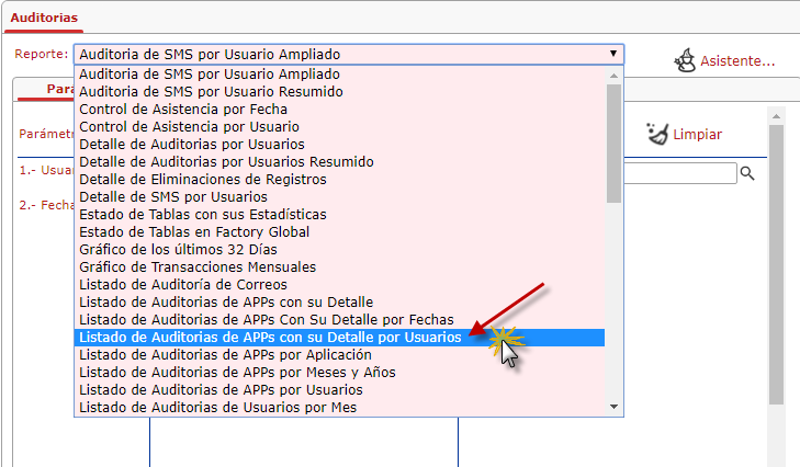 a. Se muestra la ventana de Auditorias, donde Buscaremos el Reportes de "Listado de Auditorias de la APPs con su Detalle por Usuarios".