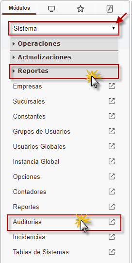 b. En el módulo Sistema, desplegamos el componente Reportes y activamos el sub componente Auditorias.