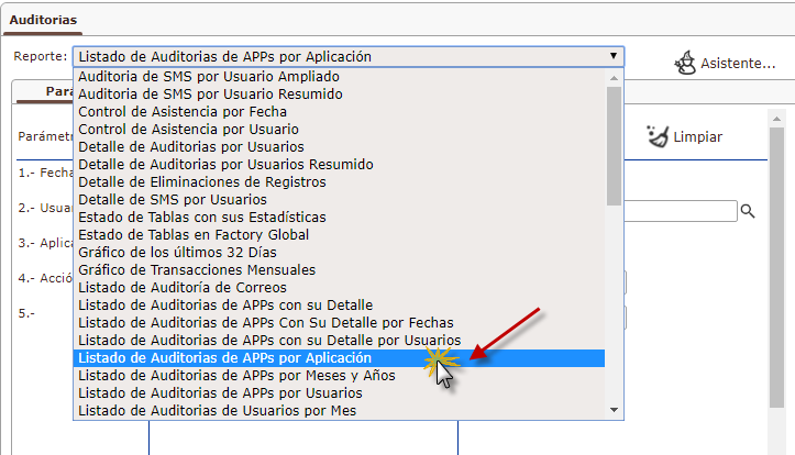 a. Se muestra la ventana de Auditorias, donde Buscaremos el Reportes de "Listado de Auditorias de la APPs por Aplicación".